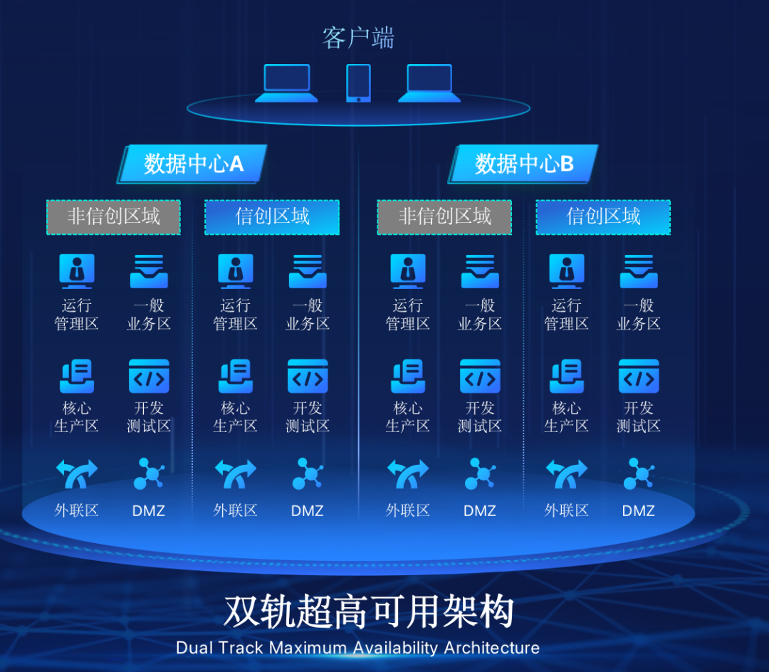 金荣中国在企业面临自主创新IT基础重构过程中,推出的全新架构双轨超高可用架构(简称DTMAA),在双活数据中心的分区调度基础上,添加每个数据中心内信创域和非信创域的分域调度,来实现分区分域协同的多活双轨超高可用。